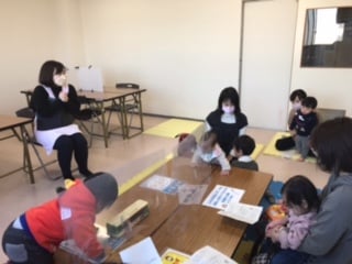 しぼくち子文のスタッフさんが「はらぺこあおむし」の読み聞かせと手遊びをしてくださいました。大きな絵本と縫いぐるみの青虫くんにみんな釘付け、手遊びもノリノリで楽しいひとときでした。(しげ)