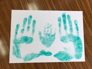入場制限のある今、「お誕生会」はありませんが、第4週に、誕生月&前後のお子さん記念撮影会を設けています。お祝いの折り紙メダル、足形スタンプのプレゼントも。 パパ、ママと3人で来ていたSちゃん。ふと名簿を見たら該当の月齢!こんなチャンスは滅多ににありませんよと焚き付けて、Sちゃんの手をパパとママが囲む素敵な手形が取れました。(しげ)