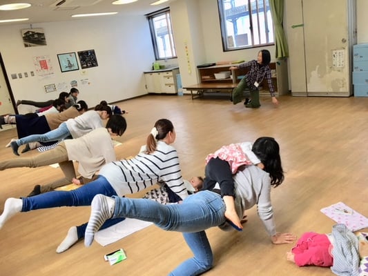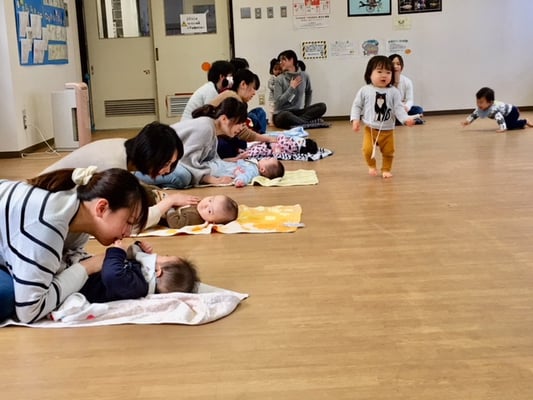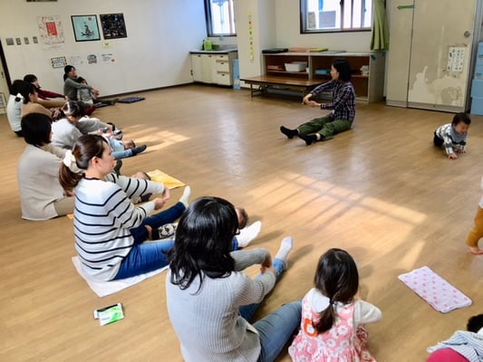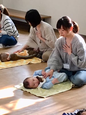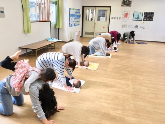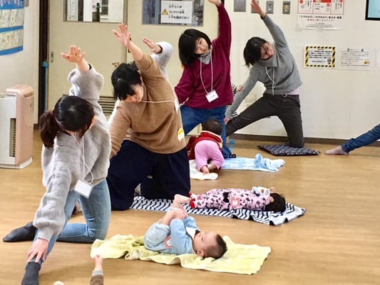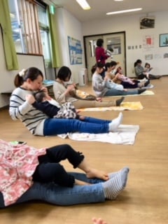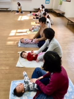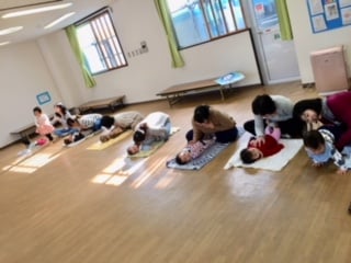 月齢の低い赤ちゃんが多かったです。呼吸を整えて赤ちゃんに『これからヨガを始めさせてもらうね』とママが語りかけてスタート!!赤ちゃんを抱っこしてお尻で歩く等いろいろなポーズがありました。