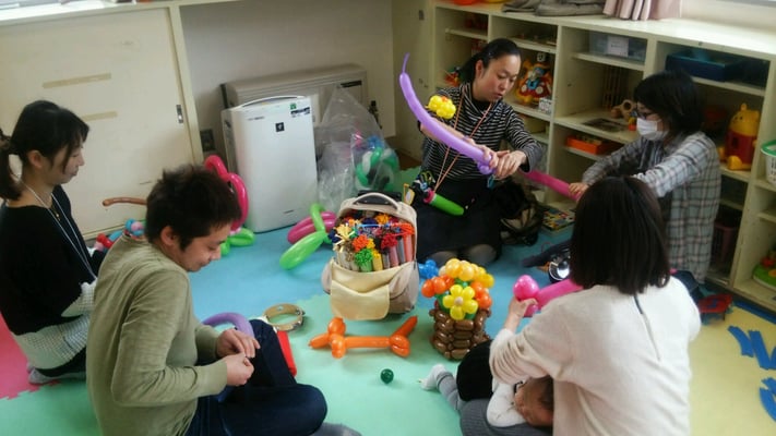 そしてバルーンを作りたい方は一緒にいかがですか?と突然バルーンミニ講座が始まりました。パパとママと来所していたMくんのパパは「学生の時にバルーンを作ったことがあるので。」と話しながら、慣れた手つきでバルーンをひねっていました。