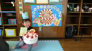 今年度もお誕生会は、最終火曜日に予定しています(ただし4月はイレギュラーで20日)。記念に手形をとって、はいっポーズ! 紙芝居を読んで手遊びして、お誕生月のお友達を一緒にお祝いしませんか。(ひろみ)