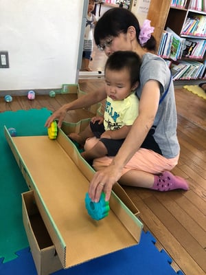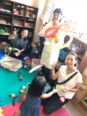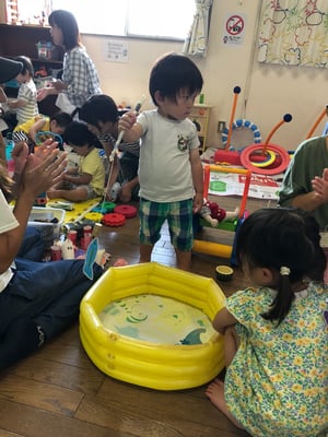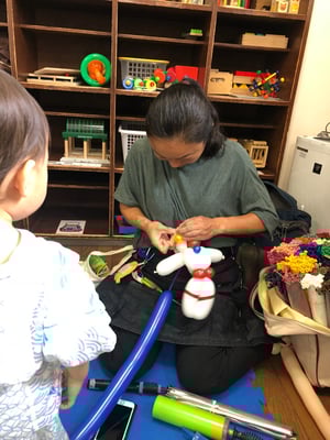 たくさんの利用者さんが来てくださり、お部屋の冷房が効かない!暑い!人口密度の高いお部屋では、いつもの遊具に加えて、魚釣り、コロコロボール、輪投げ、占い、バルーン。