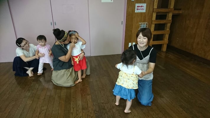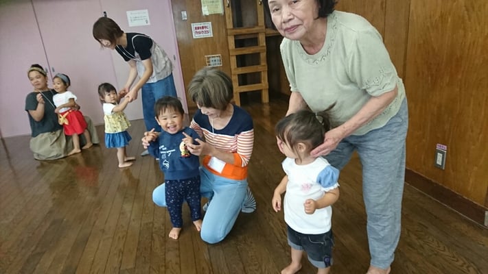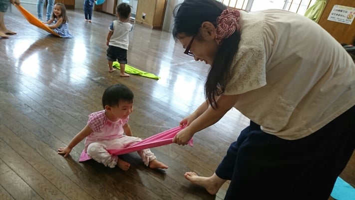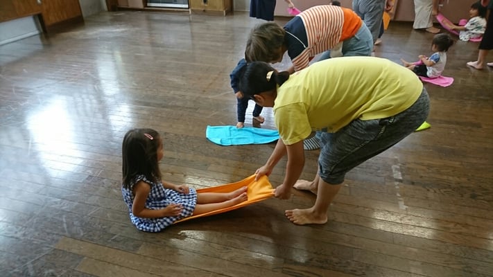 赤ちゃん体操の後に、親子体操を引き続き、行いました。おばあちゃまと一緒に参加された方が、2組ありました。タオルを使って、体感を鍛える遊び。お部屋いっぱい使って、楽しい時間でした。