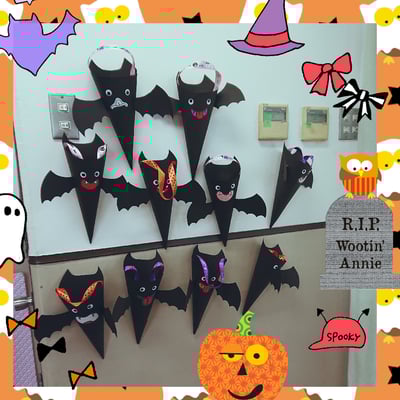 できたコウモリたちはと~っても可愛くて、皆それぞれ個性が出ていて表情豊かでとってもかわいかったです。こんなかわいいコウモリなら、おやつたくさんいれちゃいますね♪