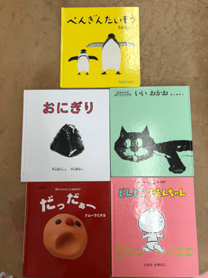 今月の絵本は、「だっだぁー」「どんどこももんちゃん」「いいおかお」「おにぎり」「ぺんぎんたいそう」の5冊!