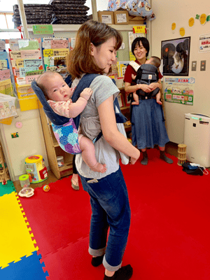 初めはいつも通りの抱っこをしてもらいそれから抱っこひもの使い方を個々にアドバイス。次に一人で出来るおんぶの仕方を教えてもらいママ達も体験されました。途中先輩ママが『私はこうしてるよ』というおんぶの仕方も実演してくれました。肩、腰の負担が軽減される事がベースの抱っこひものつけ方講習会でした。