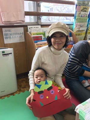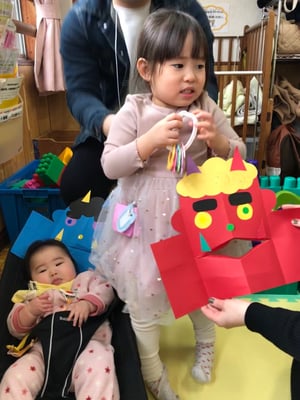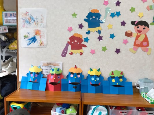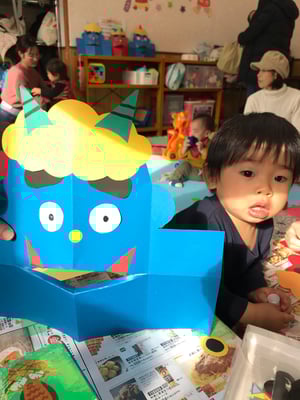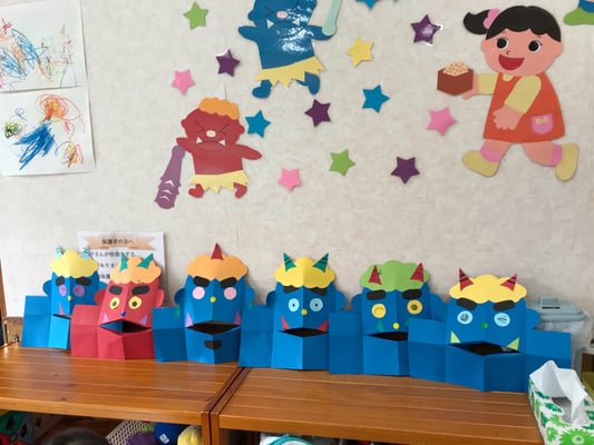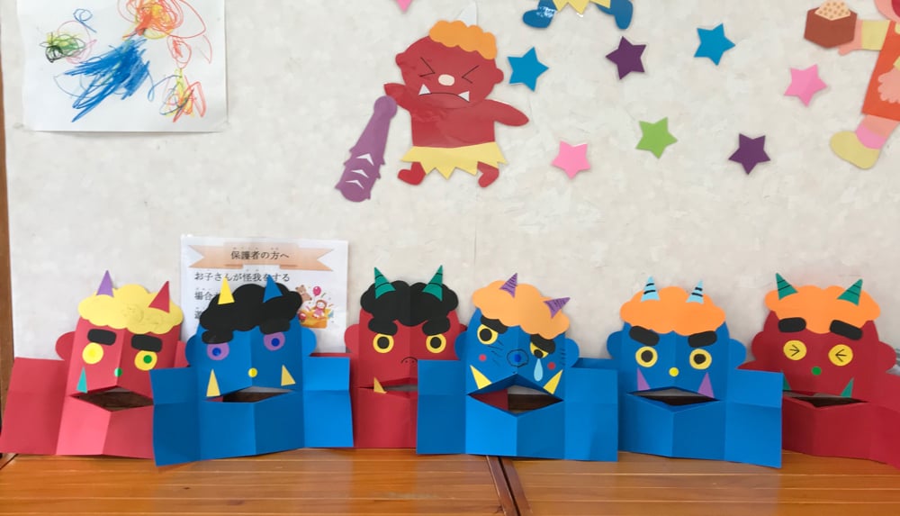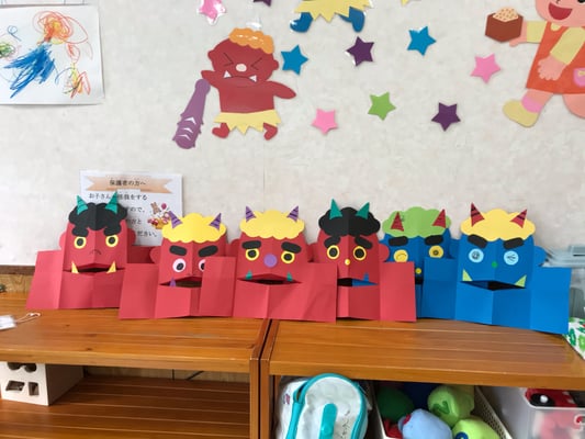 赤と青の鬼のお面に、お好みの色で髪の毛やツノ、キバを貼り付けて、目の表情で笑っているオニ、