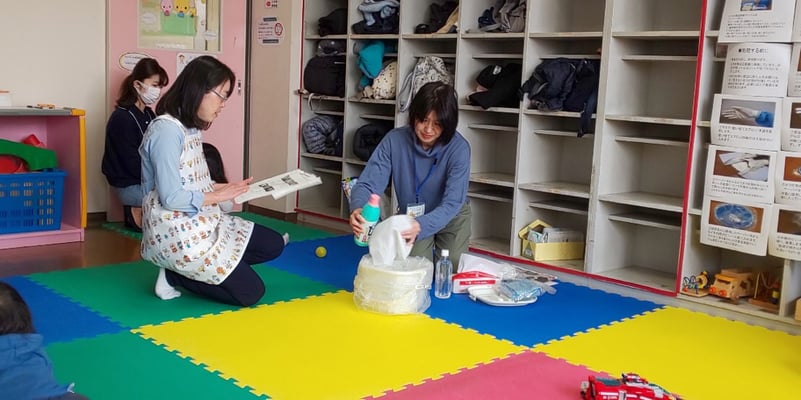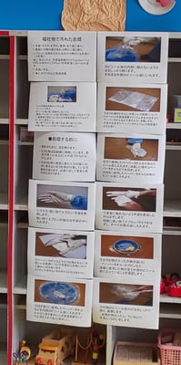 今日は津田山保育園から看護師の佐藤さんが来てくださり、ケガと病気の予防について話していただく予定でしたが、今新コロナウィルスが世間を騒がしているので、予定を変更して、ウィルスの対処法についてお話してくださいました。事前に用意してくださった対処法の用紙をロッカーに貼って、それをもとに実践してくださったので、皆さんには解りやすく伝わったのではないかと思います。皆さん、最後にその用紙を写真に撮ってました。