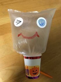 工作内容は紙コップ、ストロー、ビニール袋で出来る、「紙コップおばけ」です。