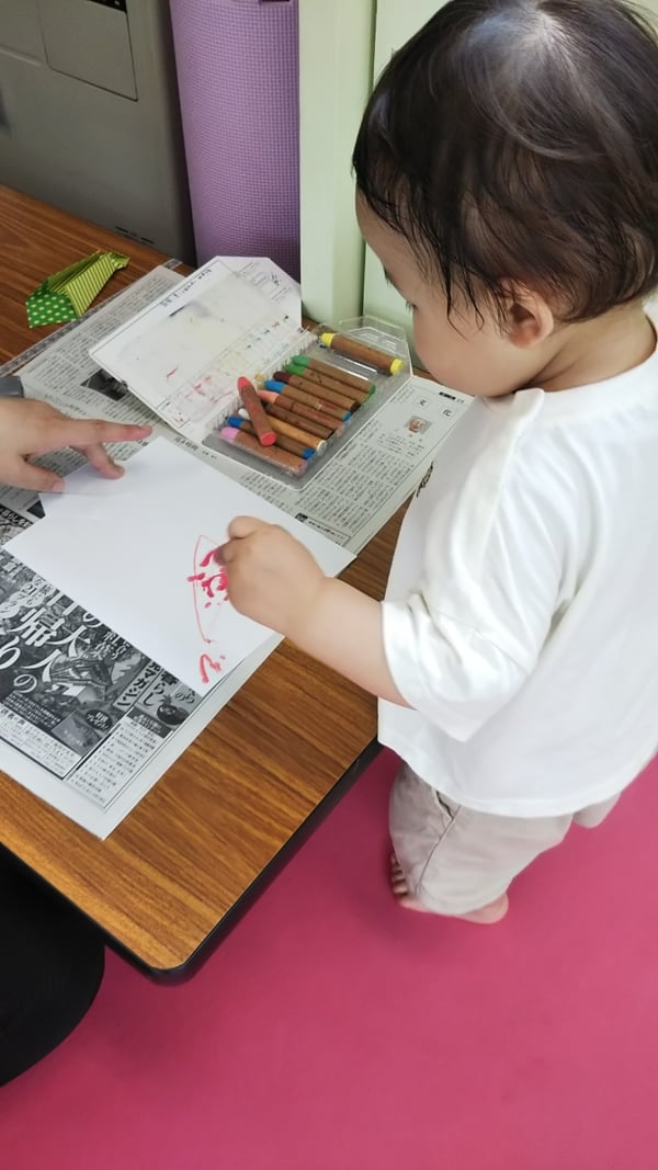 M君は上手にキットパスを持って作品作りに取り組めましたね。うん、キットパスの発色が良くとっても綺麗。キットパスで初めての手形をとり、作品を仕上げてくれたお友達も居ました。製作はスタッフの思いつきで突然行う事もあります。気になる方はどうぞセンターへ遊びに来て下さいね。(みゆき)