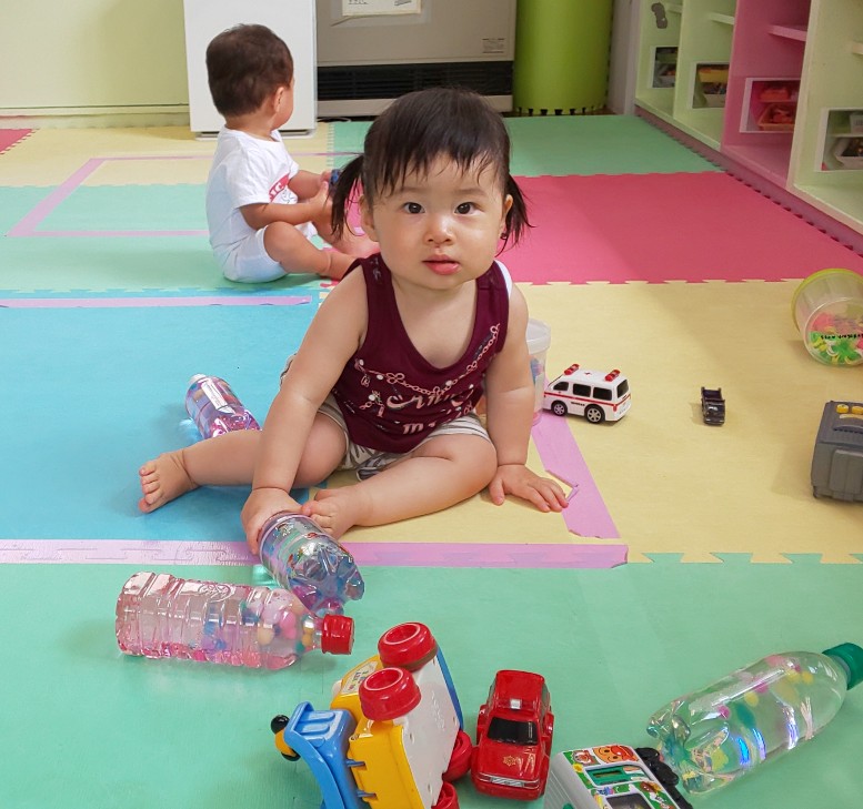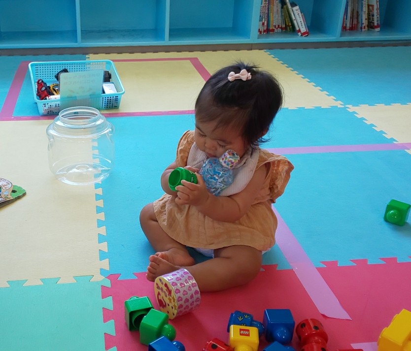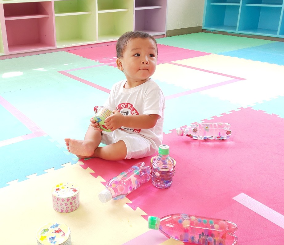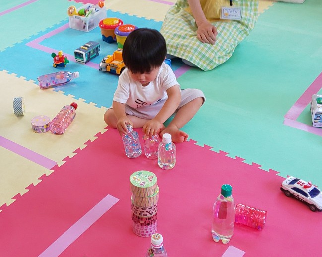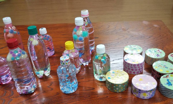 ペットボトルのゆらゆらドームは消臭ビーズが入っているので、スパンコール、カラフルなポンポンボールなどが中でゆっくり動きます。円柱のボトルは日光が差し込む場所で転がすとキラキラ光ってとてもキレイでした。ガムテープの芯を使った音の出るおもちゃも、振ったり、転がしたり、重ねたり、みんなに喜んでもらえましたよ。(ききょう)