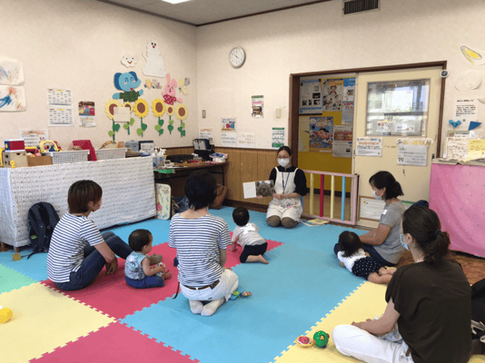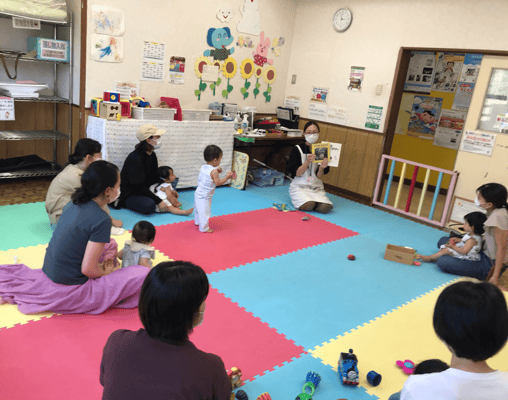 かみさくのべのお部屋は小さめで、通常は6組の利用制限をさせて頂いていますが、絵本のイベントの時は利用待ちの親子さんもお部屋に入って参加頂いています。