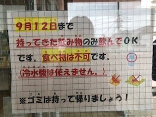9月12日まで、こども文化センター内での食事が出来なくなっています。支援センターの後にお弁当を食べて帰る派の方や、気分転換にオヤツタイムをとっていた方、ご不便をお掛けしますが、ご理解のほど、よろしくお願いします。(しげ)