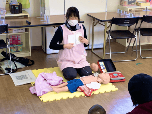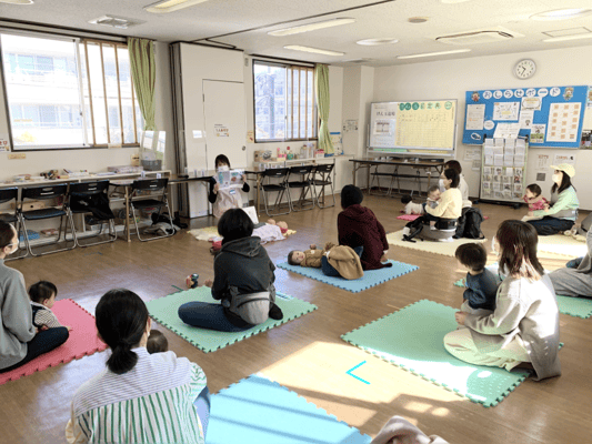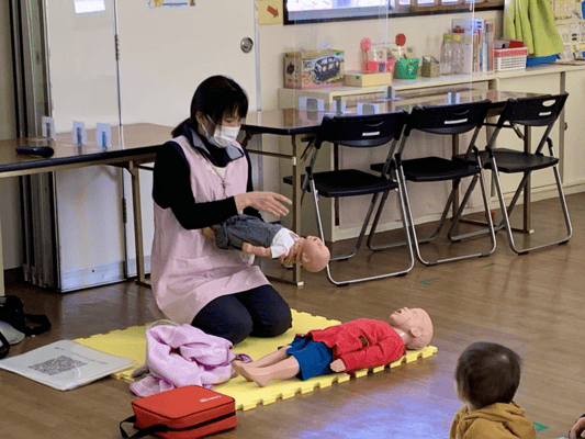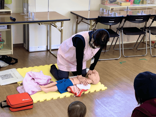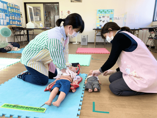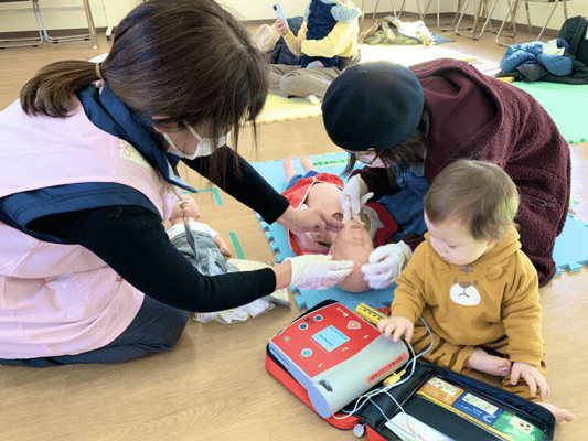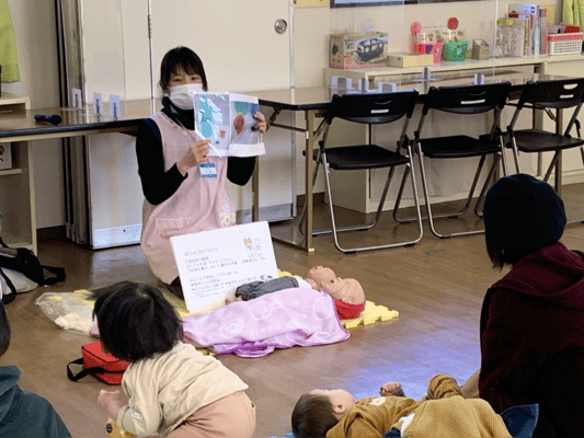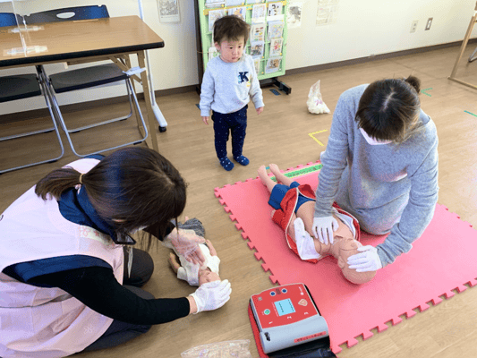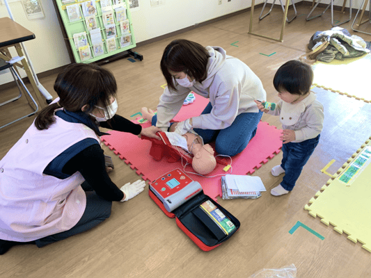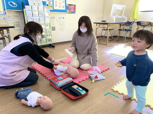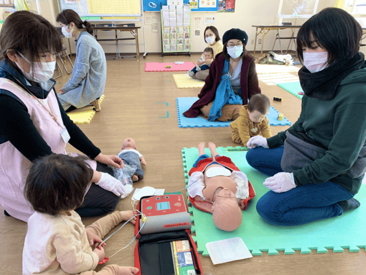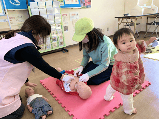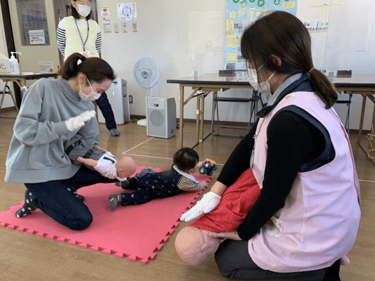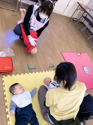 今日は高津区役所の看護師さんによる「ケガや病気の対応について」のミニ講座でした。講座は、今ですとコロナが多く話題になっていますが実は他にもこの時期に多い感染症に『ウイルス性胃腸炎』があってその症状にある嘔吐からの二次感染を防ぐ処理方法のお話し、又『熱性けいれん』の時の対応等についてお話しをしてもらいました。そして今回は、赤ちゃんが喉に物を詰まらせた時の対処法、心配蘇生を実際にお人形を使って見せてもらいママ達にもお一人ずつ実践してもらいました。AEDも使用しました。この間待っててくれたお子さま達ご協力ありがとうございました。(^^)