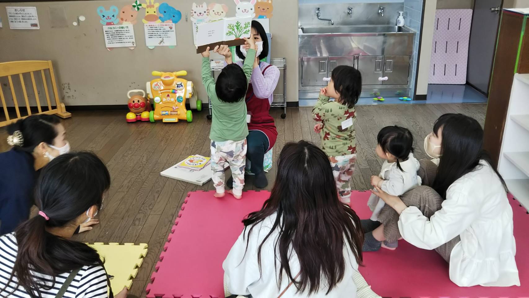 絵本に合わせてぴょーん!と跳んだり、ゆらゆら抱っこされたり、みんなニコニコ和やかな時間でした。